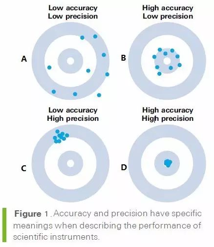 從上圖中可看出,Accuracy“準確度”是表示測量值和真實值之間有多接近,是用戶所第一重視的儀器準確性的表征;而Precision“精度”指的是測量的重復(fù)性,即每次測量是否得到相同的值,但該值是否接近真實值就不一定了。例如上圖中不難看出圖D是性能最佳,準確度和精度都是最好,圖A是最差的。但是圖B和圖C相比較,哪一臺儀器測量的更加準確呢?當然是圖B,更接近靶心;但是如果不理解precision和Accuracy的區(qū)別,僅僅根據(jù)precision的數(shù)值比較,則很有可能得出的結(jié)論是圖C,因為圖C的點看似更為“密集”,precision好,但是得到的結(jié)果和真實值卻相去甚遠,換句話說,該儀器測量的值重復(fù)性好,但是測出的數(shù)據(jù)是錯的?。?!