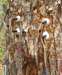 由于莖干的生長(zhǎng)和植物的自愈功能,特別是松柏類樹木分泌的粘液,都有可能造成安裝探針的孔洞變窄。長(zhǎng)期下去,會(huì)導(dǎo)致探針變形,不僅影響讀數(shù),而且當(dāng)需要更換測(cè)量對(duì)象時(shí),會(huì)在拔出探針時(shí)造成探針損毀。因此,建議用戶定期進(jìn)行維護(hù)(視樹木生長(zhǎng)情況和樹種而定),一般建議2 周左右。通常情況下,只需拔出TDP探針重新安裝即可,嚴(yán)重時(shí)需要擴(kuò)孔甚至更換安裝位置。